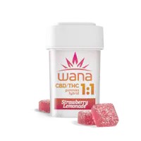 Strawberry Lemonade | 1:1 CBD/THC Per Package: 100mg CBD & THC Per Piece: 10mg CBD & THC Balancing notes of bright citrus and lush strawberry, these gummies contain a smooth, calming ratio of CBD and THC. Like all Wana edibles, they're vegan, melt-proof, made with organic sweeteners, and enhanced with 30+ terpenes.