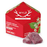 *HIGH-DOSE MEDICAL* Wyld's Raspberry Sativa Enhanced gummies are made with real fruit and enhanced with botanical terpenes that assist in creating both euphoric and energizing experiences. Ideal for keeping you focused on the task at hand, refining your creative endeavors, or even better, finding your own adventure! 200mg THC per pkg, 20mg THC per gummy Serving Size: 1 Piece (4g) Ingredients: Sugar, Tapioca Syrup, Water, Raspberry Juice Concentrate, Gelatin, Natural Flavoring, Citric Acid, Coconut Oil, Pectin (Pectin, Sodium Citrate), Cannabis Extract Oil, Sunflower Lecithin. Contains: Coconut Calories: 10, Total Carbs: 3g, Total Sugars: 2g