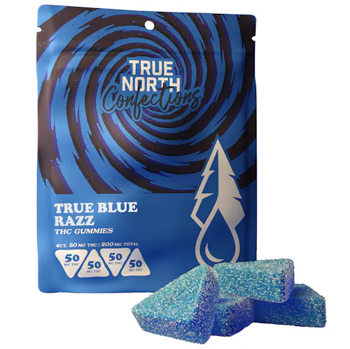 True North Confections True Blue Razz premium THC infused gummies feature an improved vegan formula! These 50 mg pieces are gluten free, dairy free and made with local Michigan farm sourced beet sugar along with natural Berry flavors.