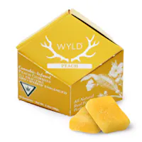 New to edibles? Wyld Peach gummies are made with a higher CBD than THC ratio, making them a great option for easing into edibles and finding your desired experience. They are made with real fruit and enhanced with a balanced terpene profile that may assist in creating a sense of ease and overall well-being. Ideal for when you need to take a break! Dosage: 100mg CBD:50mg THC per pkg, 10mg CBD:5mg THC per gummy Terpenes: Limonene, Linalool, Alpha Pinene, Beta Pinene